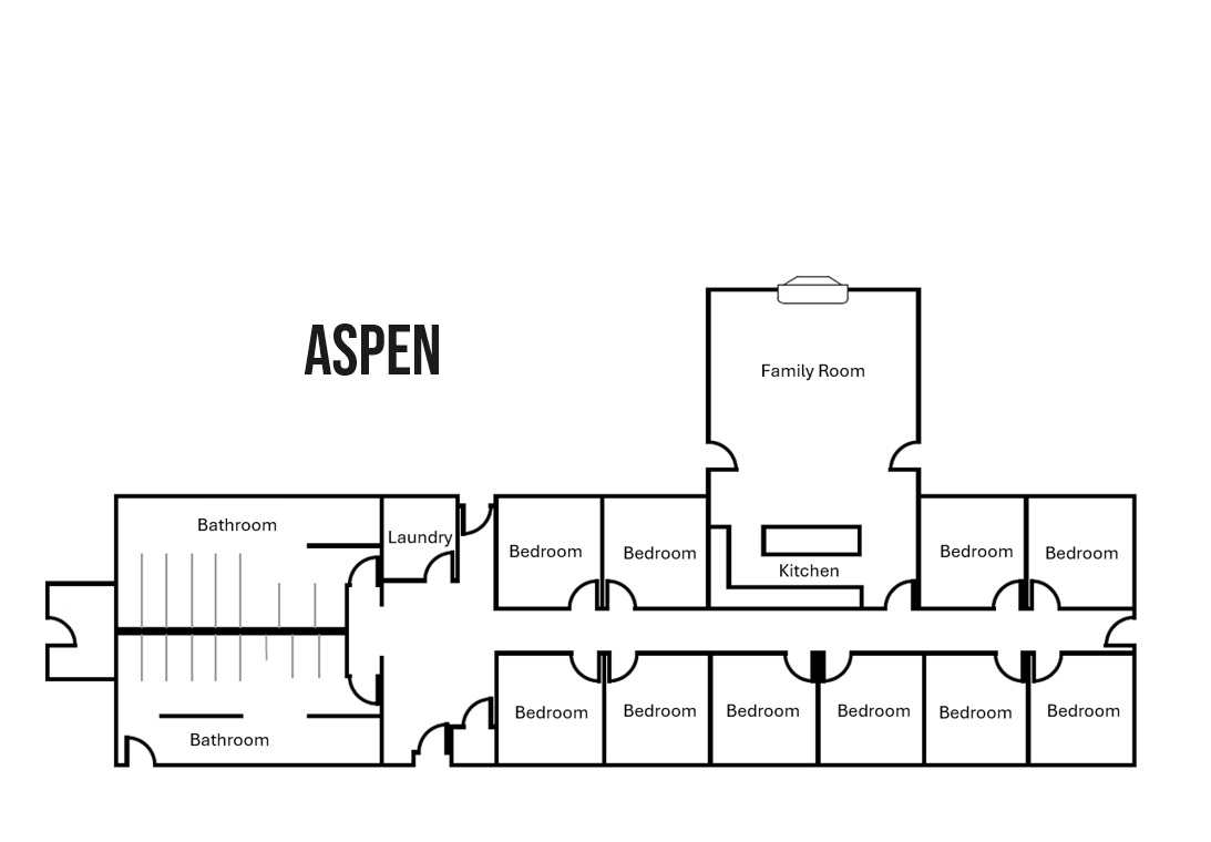 Aspen is 10 bedroom apartment with 2 students in each room. Aspen includes a common bathroom (down the hall), as well as a shared kitchen/ family room with a fireplace. Aspen building layout view.