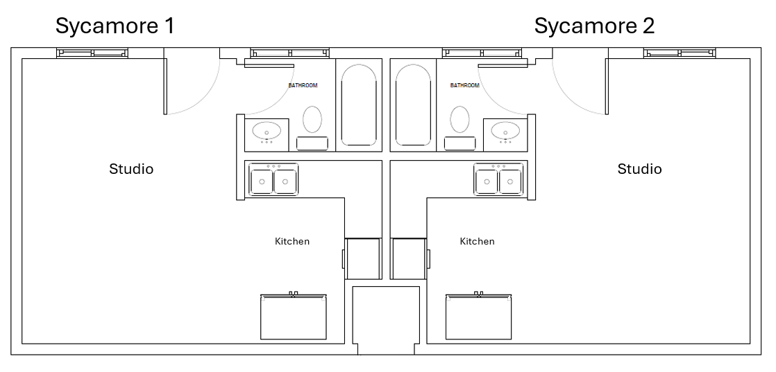 Sycamore is a 2-unit apartment building with 2 students in each 1-room studio. Each Sycamore studio includes an en suite bathroom and a kitchen. Sycamore apartment layout view.