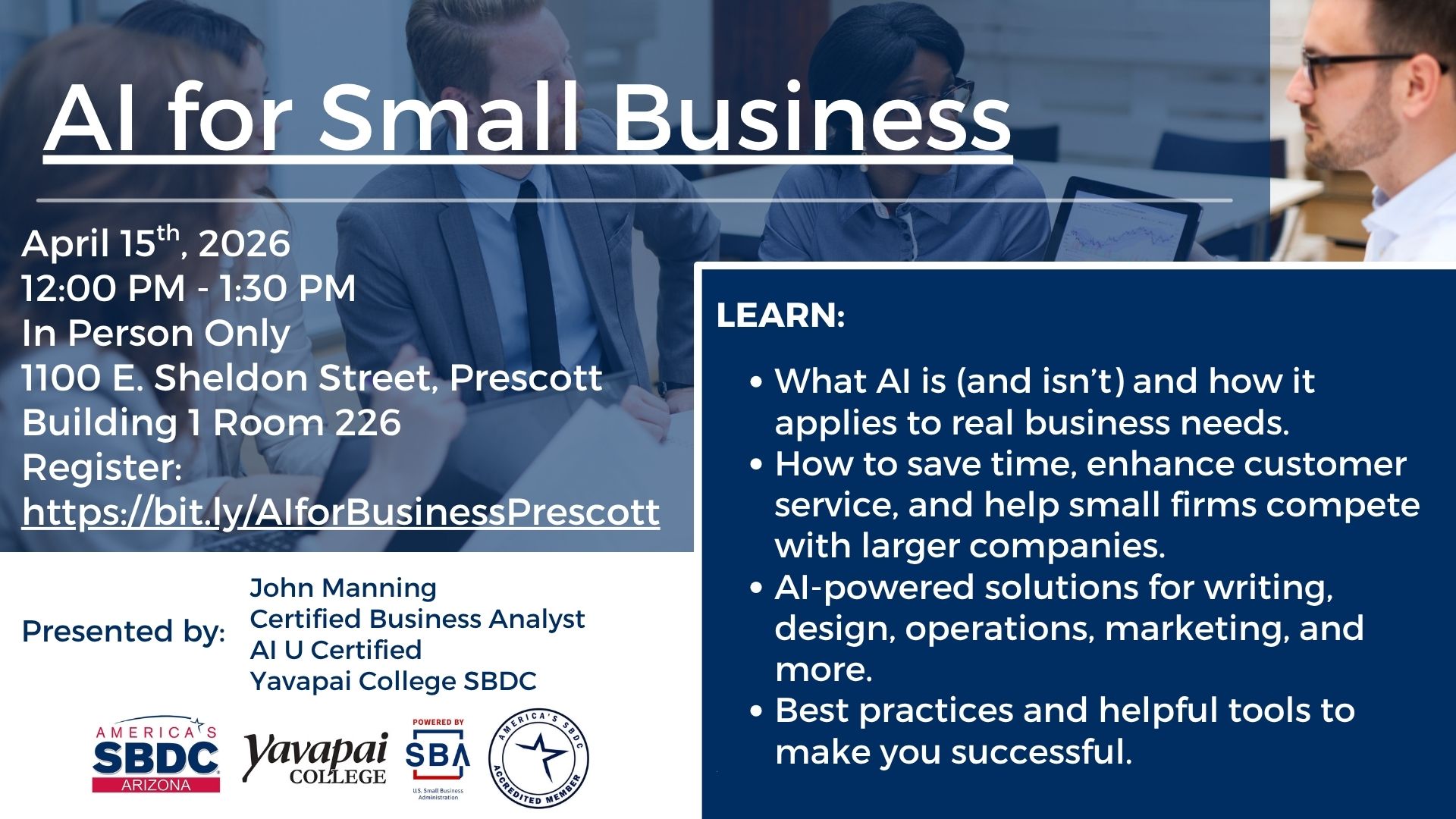 Join us for an in-person workshop designed to help small business owners harness the power of AI. Discover how AI can streamline your operations, enhance customer service, and help you compete more effectively.