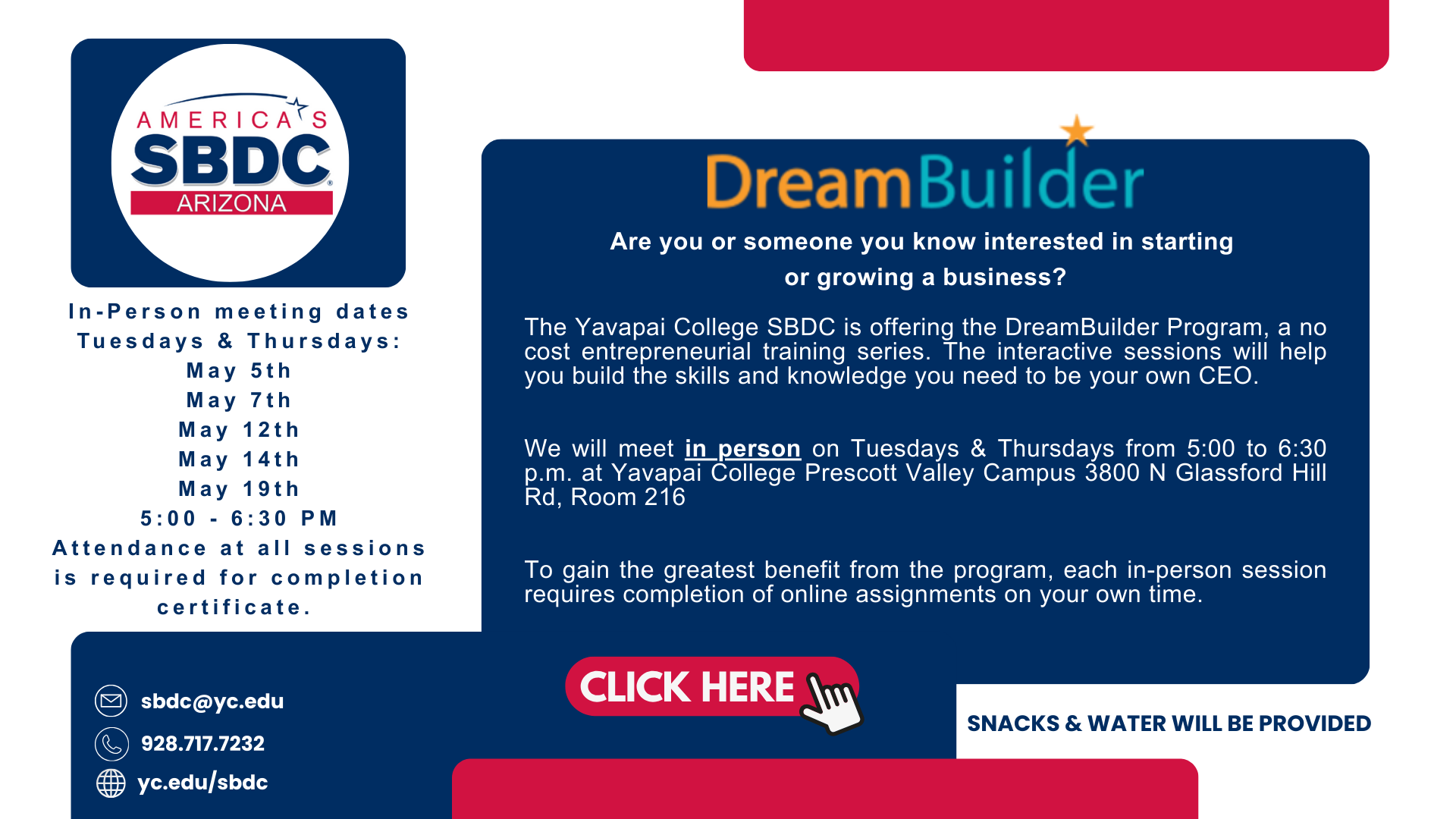The Yavapai College SBDC is offering the DreamBuilder Program, a no cost entrepreneurial training series. The interactive sessions will help you build the skills and knowledge you need to be your own CEO.